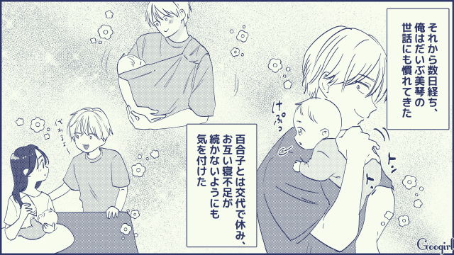 百合子の母からもお灸を据えられ、母親から徹底的に家事と育児を叩き込まれた隆司。美琴のお世話にもだいぶ慣れ、寝不足にならないよう百合子の体も気遣ったのでした。最初は百合子に丸投げだった隆司にも、父親の自覚が芽生えたのですね。