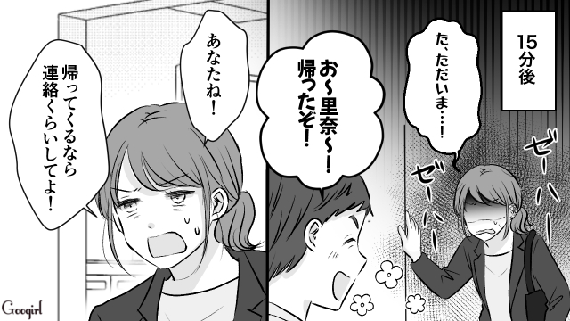 一方口座から30万円がなくなっていることに気づいた里奈は驚き、慌てて義則に電話をしますがつながりません。会社にも電話したところ体調不良で休んでいると言われ、義則の安否を心配し単身赴任先に出向きます。合鍵で部屋に入りますが、趣味満載の散らかった光景に唖然とするのでした。パソコンでクレジットカードの履歴を確認し、30万円を使ったのは義則だと確信した里奈。さらにキャバクラの名刺と領収書を発見し、怒りをあらわにしたのでした。