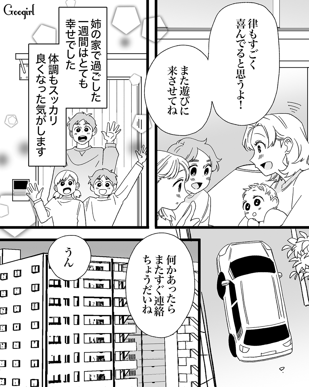 翌日も真帆を無視する誠司に、姉の家で体を休めたいと相談したところ「好きにすれば」と言われます。その態度にモヤモヤしたものの、体調を戻すことを優先し、姉の家でお世話になります。姉はもちろん、夫や子どもたちも律をかわいがってくれ、「こんな家庭で律を育てたかった」と涙したのでした。