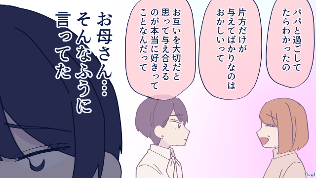 翌日も会社を休んだ朔。さらにお昼も食べず、仕事から帰ってきた理奈に夕飯を作らせます。さらに次の日も会社を休み、里奈を困らせたのでした。その日仕事を終え、帰りづらいと思いつつも実家に出向いた里奈。でも何かを察したのかお母さんは明るく迎え入れ、里奈の好きなすき焼きを用意してくれました。そして里奈と同じく世話焼きで、ダメンズウォーカーだった話をします。しかし里奈の祖母がいまの夫を褒めてくれ、結婚した過去がありました。何かしてあげるとお礼を言うのはもちろん、お返しもしてくれる夫と過ごし、片方だけが与えてばかりの関係はおかしいと気づいたお母さん。その話を聞き、里奈は胸が熱くなったのでした。
