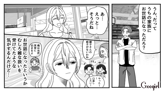 ある日家族とテレビ電話をする亮介ですが、話の流れで次の週末は優子も一緒に帰省することになりました。はじめての義実家訪問に緊張する優子は身だしなみやマナーを気にしますが、家族と会えることが楽しみな亮介は優子を気遣う素振りもありません。