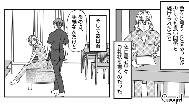 義家族との夕飯が終わりホテルへ向かう優子と、当然のように実家に泊まる亮介。ひとりホテルに着き複雑な思いを抱える優子ですが、翌朝も亮介と義家族が迎えに来ます。モーニングでも嫌味を言われた優子はやっと東京に帰りますが、その際に亮介からおばあちゃんにお礼の手紙を書いてほしいと言われました。