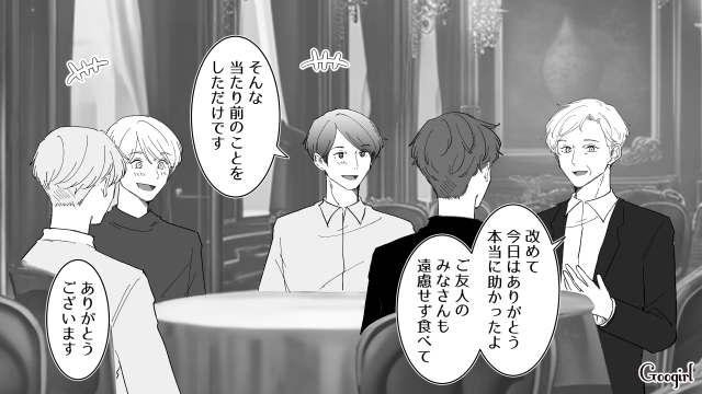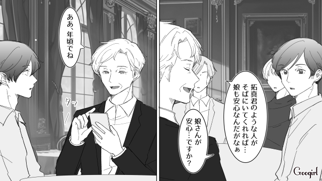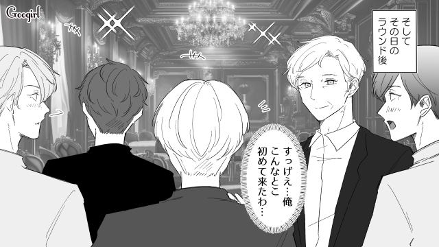 しかしのらりくらりとはぐらかした挙句、次の週末はゴルフに行くと言われてしまいました。友人のツテで高級会員制ゴルフクラブに入れた拓真は、リッチな世界に衝撃を受けます。そこで探し物をする中年男性・俊一と出会い、拓真は何の見返りも求めずに助けます。大企業の社長である俊一は、お礼に拓真を食事に誘ったのでした。