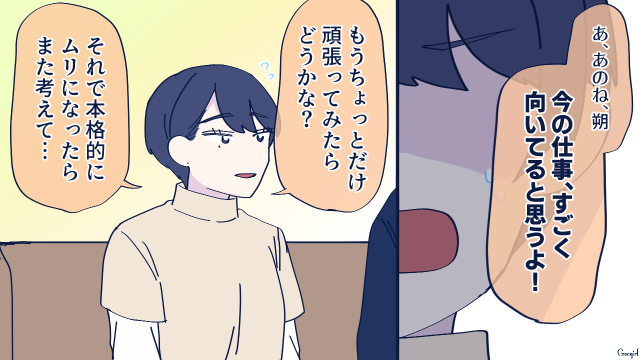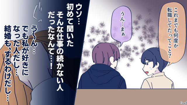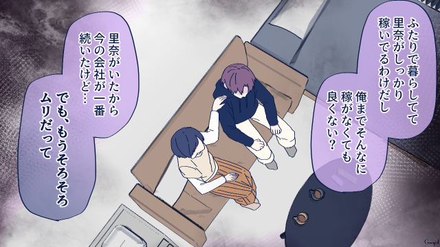 突然朔が仕事を辞めたいと言い出し、戸惑った里奈。何とか説得して退職は阻止しましたが、実は職を転々としていたと知り驚いたのでした。もうすぐ結婚予定なのに、彼女の稼ぎをアテにして、「俺までそんなに稼がなくても良くない?」と言い出したら戸惑いますよね。
