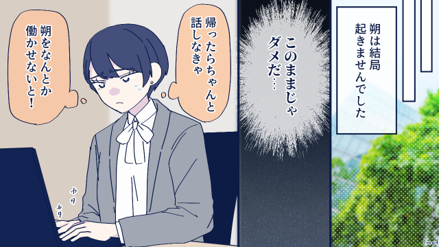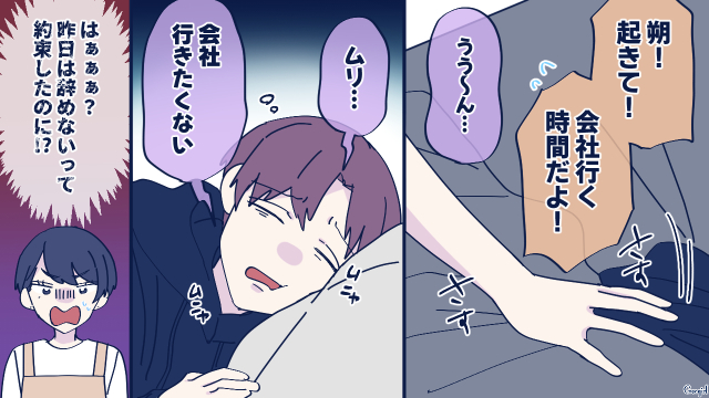 昨夜は仕事を辞めないと約束したのに、翌日になり会社を休んだ朔。しかも自分で昼食すら用意せず、仕事から帰宅する里奈を待っていたのでした。一瞬かわいいと思った里奈でしたが、こんな男性と結婚したらあとが大変ですよね……。
