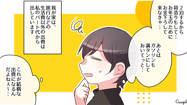 義実家帰省はただでさえ気を使う上、サトシが4人きょうだいのためお年玉などの出費も痛かったユキコ。慌ただしく家事をしなければならないこともストレスで、頭を悩ませていたのでした。せめてサトシには大変な状況を理解してほしいですが、軽く受け流されてしまうとモヤモヤしますよね。