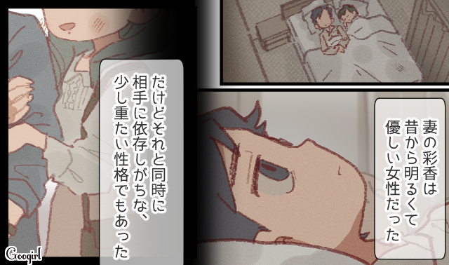 結婚後、直哉の地元に引っ越した彩香。しかし直哉の単身赴任が決まり孤独にさいなまれます。そんなときに鍵を失くした蓮司と出会いました。鍵を見つけてあげたところ友達になってほしいと言われ、時々お茶するようになります。直哉の単身赴任で寂しさを感じていた彩香には、救いのような時間だったのでした。しかし蓮司から猛アプローチされ、一線を越えてしまいます。それ以来、正常な判断ができなくなった彩香は貢いだり家に連れ込んだりした上、彰斗自身を疎ましく感じます。