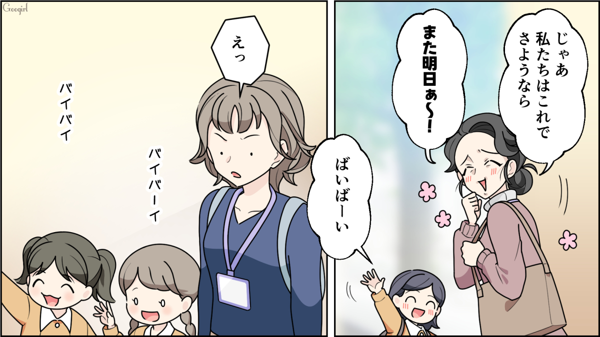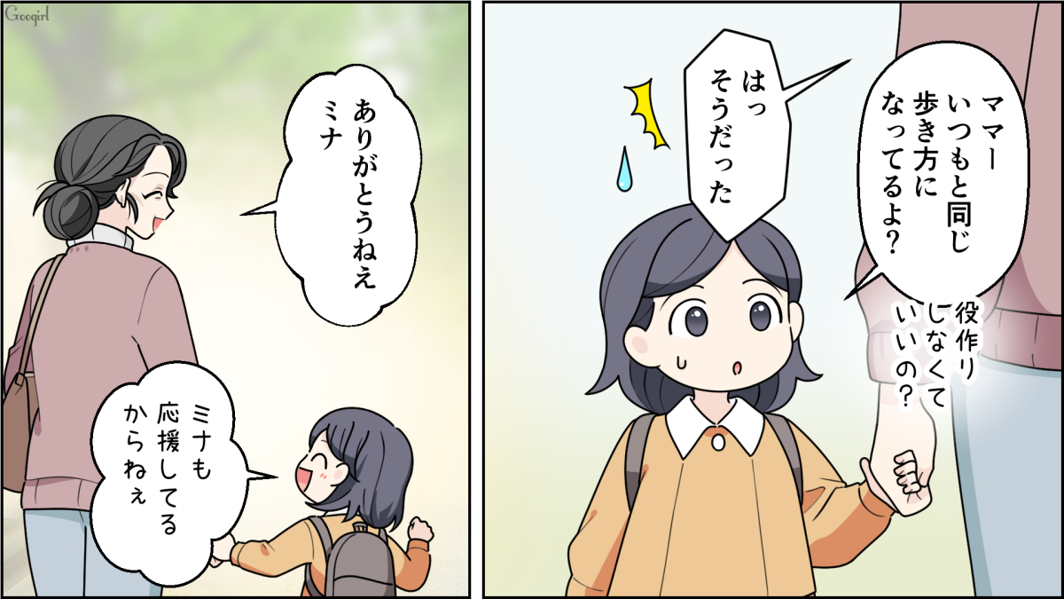主人公・角谷サナエ(32)は夫・ユキト(33)と娘・ミナ(5)の3人家族です。マンション購入とともに引っ越してきたサナエは舞台女優をしており、昭和の40代母親を演じることになりました。しかしなかなか監督からOKがもらえず、日常的に役作りをはじめます。メイクや服装、姿勢などから40代母親になり切ったサナエは、保育園初日にミナの送り迎えをします。しかしその姿を見たチヒロの母・井上さんは「なにあのおばさん」と呟いたのでした。