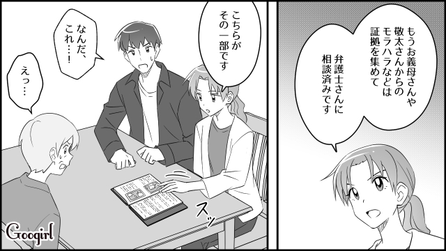 さらに結婚式のアルバムを破り捨てられた秋奈は敬太に相談しますが、義母の肩を持たれてしまいます。これをきっかけに離婚を決意した秋奈は弁護士に相談し、証拠集めに入ります。そんな中、義母が敬太を使って秋奈の預金口座にまで手を出そうとします。身の危険を感じた秋奈は、急いで離婚の準備を進めるのでした。