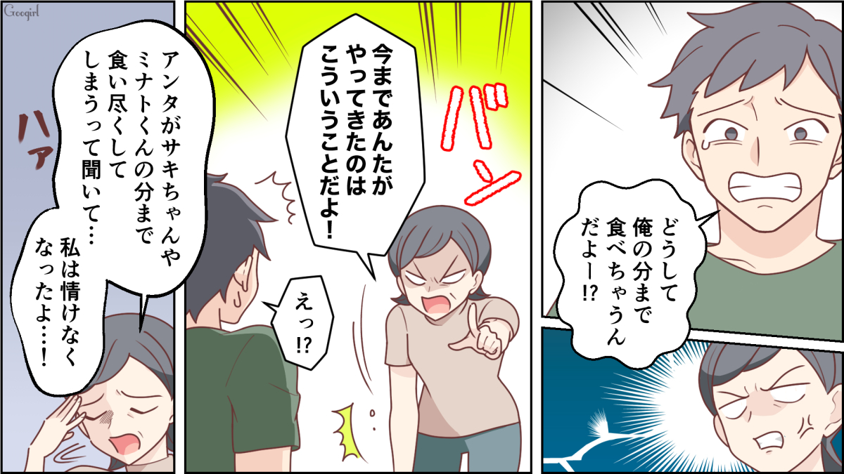 でも夜中に起きてきた斗真が、ミナトが楽しみにしていたケーキを食べてしまいます。翌日になりミナトが泣き出しても、謝るどころか屁理屈ばかり並べる斗真。怒ったサキがミナトを連れて実家に帰ると、義両親と義姉が遊びに来ていました。