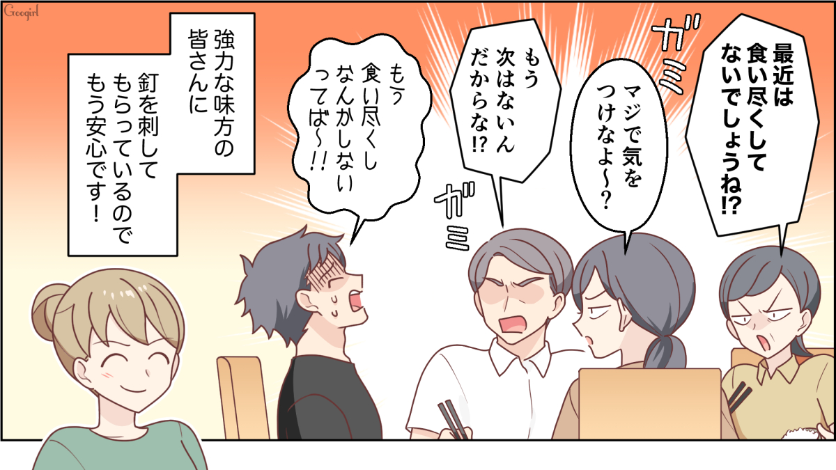 相手を選んで食い尽くす姿を見て、なおさらタチが悪く感じたサキ。さらにミナトの離乳食まで食い尽くされ、大皿を並べないようにしたり、お菓子やパンの袋に記名したりと、徹底して対策するようになったのでした。