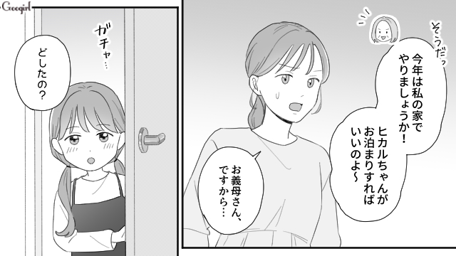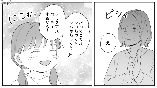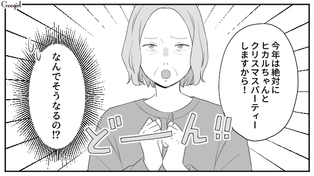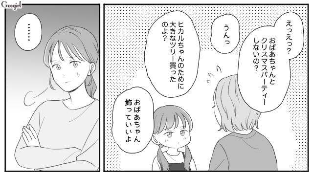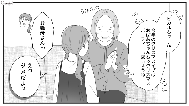 ヒカルが5歳になり、友達とクリスマスパーティーを開くことになりますが、なぜか義母が「今年のクリスマスパーティー楽しみね!」と言い出します。しかも24日から1泊すると言い出し、慌てて友達とパーティーを開く予定を伝えます。しかしヒカルと一緒に過ごしたい義母は「断ればいい」「私のときは姑が嫌がるから、子どもたちとクリスマスパーティーなんてできなかった」と身勝手な持論を展開したのでした。
