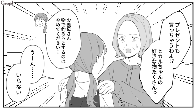絶対にクリスマスパーティーがしたい義母は、おもちゃでヒカルを釣ろうとしたのでした。しかしまぶしい笑顔で「プレゼントはサンタさんからもらう」と言われてしまった義母。子どもにも楽しみにしている計画があるのですから、大人の都合で振り回すのはやめてほしいですよね。