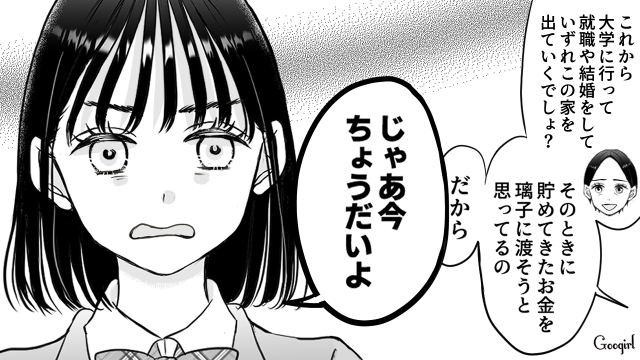 将来のための貯金なのに、ブランド品が欲しいからと「じゃあ今ちょうだいよ」と言い放った璃子。さらに母の前で「親ガチャミスったわ」と暴言を吐いたのでした。もう高校生なのですから、言っていいことと悪いことの分別くらいつけてほしいですよね。