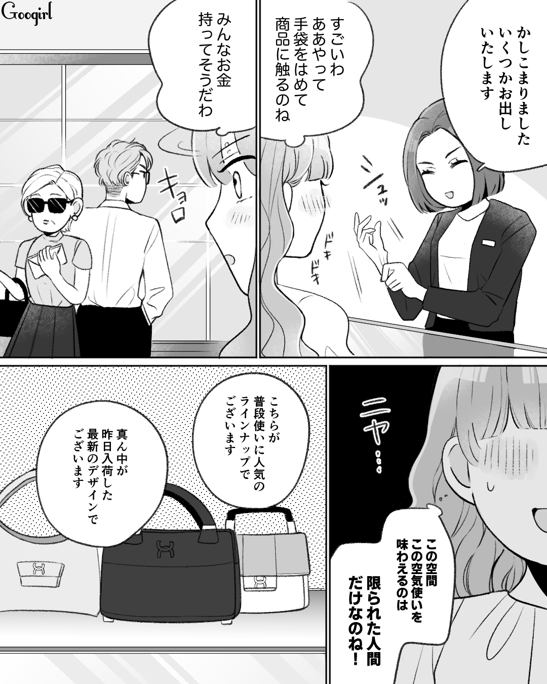 高級バッグを手に入れた高揚感がたまらなくなり、さらに高いバッグを値段も見ずに購入した七瀬なのでした。いいものを身につければ自分の魅力も増すと思い込んでいるのでしょうが、それだけに固執すると中身が空っぽの虚しい人間になってしまいますよね。