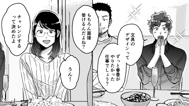 翌日から職場で春香を無視する純也。一方社内報の表紙を描いていた春香は、上司からデザイン会社のスカウトを受けます。夢だった文具デザインができると知りうれしい反面、就活に失敗した春香は相手を失望させるだけではと不安になります。そんな姿を見て、「春香は自信を持って大丈夫」と背中を押した純也。さらに「いろいろとごめんな?」「俺も大阪で頑張るから、春香も頑張れ!」と言われ前を向くことを決意したのでした。その日の晩、圭子と太郎、潤と食事をした春香は……?