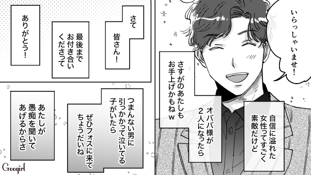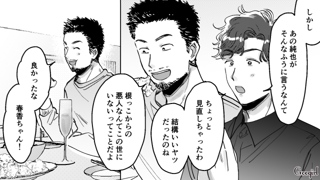 その後フォスへ行き、無事に啖呵を切ったことを太郎に報告しますが、怒った純也から電話が来ました。フォスにやってきた純也は、案の定春香にモラハラをします。そこにイケメンの太郎がやってきて、「春香の元カレで、今でも春香をこの世で一番愛している男」と言い、純也に激怒します。「結婚はナシだ!」と逆ギレして帰った純也とは対照的に、春香と太郎の友情は深まったのでした。