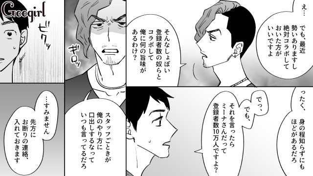 動画配信をはじめてから、登録者数でしか人を見られなくなってしまった裕司。しかし自分がお気に入りの若い女性とのコラボは決めたり、スタッフに横柄な態度を取ったりと、周囲からドン引きされてしまったのでした。どんどん天狗になり、周りとの温度差に気づいていないことが伺えます。
