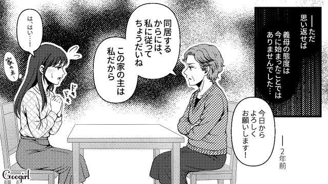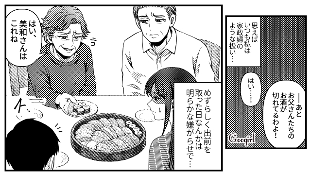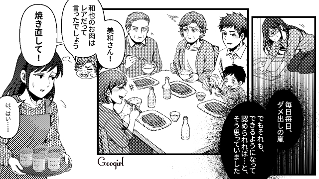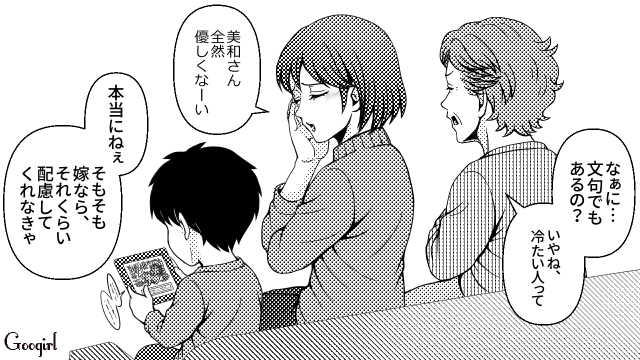 主人公・森下美和は、2年前の結婚と同時に義両親と同居しています。しかし義母から嫁いびりをされている美和は、この日も遊びに来たご近所さんの前で「気が利かない」「イマイチな嫁」と言われてしまいます。