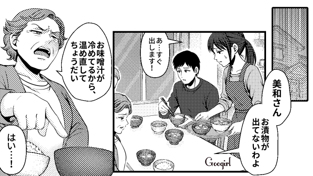 主人公・森下美和は、2年前の結婚と同時に義両親と同居しています。しかし義母から嫁いびりをされている美和は、この日も遊びに来たご近所さんの前で「気が利かない」「イマイチな嫁」と言われてしまい……?