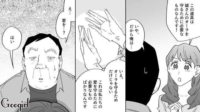 最初は騙されたと怒った誠でしたが、仲間たちからチヤホヤされ喜びます。さらに日菜子が崇拝する京子さまからオーラを褒められ、すっかりその気になります。しかし少しオーラが黒っぽいと言われた誠は、京子から1000万円の数珠を譲り受けます。日菜子とおそろいだと知り、今度こそ結婚できると信じたのでした。