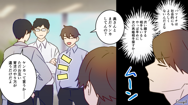 さらに出産から半年が経ち2人目を提案しますが、育児に疲弊した光から断られます。苛立った昌平が反論したところ泣かれてしまい、自分の夢が断たれると慌てて慰めました。2週間の育休を取って光の代わりに育児をすると言った昌平に「アンタの子だから育てるの当たり前だけど?」とキレた光。さらに帝王切開をバカされ愛想を尽かします。理子と家を出た光に対し「俺の人生を台無しにする気かよ」と苛立ったのでした。