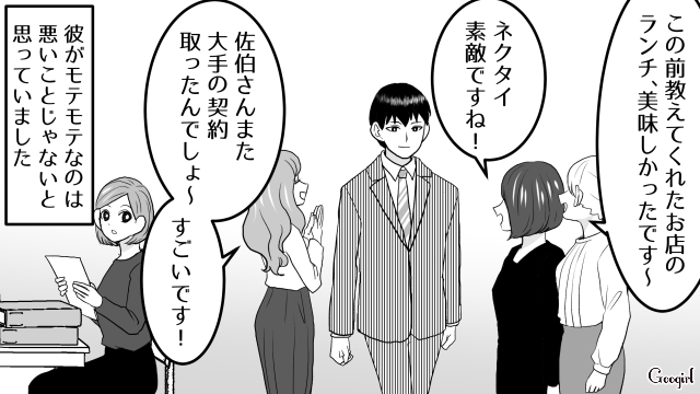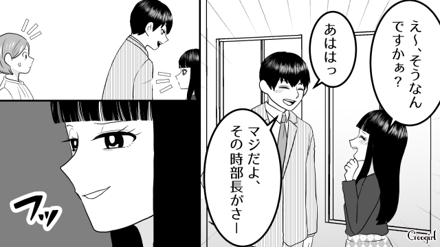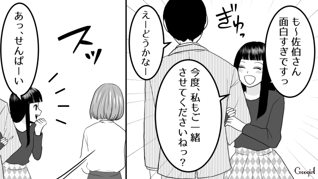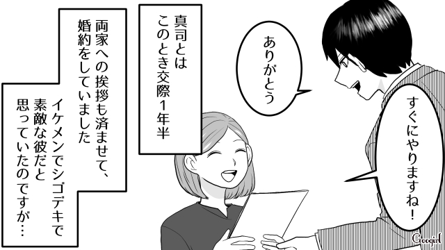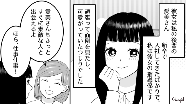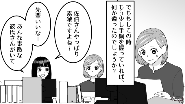 社内恋愛からの婚約と、まさに順調に見える咲良と真司。しかしモテるタイプの真司は、愛美からロックオンされてしまいました。咲良と付き合っていると知っていながら、誰にでもやる風を装って愛美の眼の前で真司にボディタッチをするなんてあざといですよね。しかしあとになると「なにかできていたら……」と思っても、渦中にいるときはびっくりして何もできないものです……。