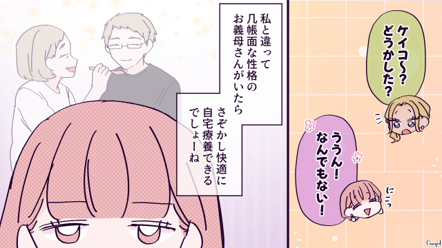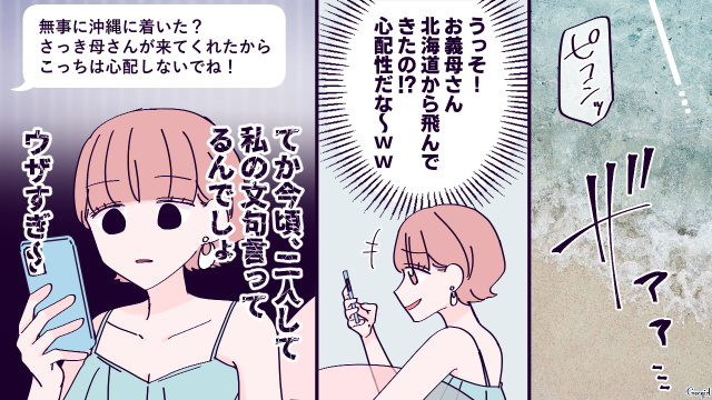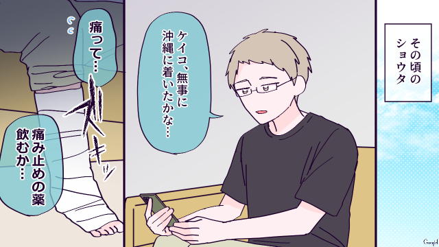 ケイコはショウタを心配するどころか「お義母さんに来てもらえばいい」と看病を拒否、ひとり沖縄へ向かいます。現地に住む友人・リカと合流したケイコですが、ショウタは仕事で来られなくなったと嘘をつきます。ふたりはバズ狙いの写真をメインに、沖縄を満喫するのでした。