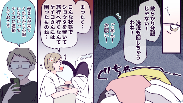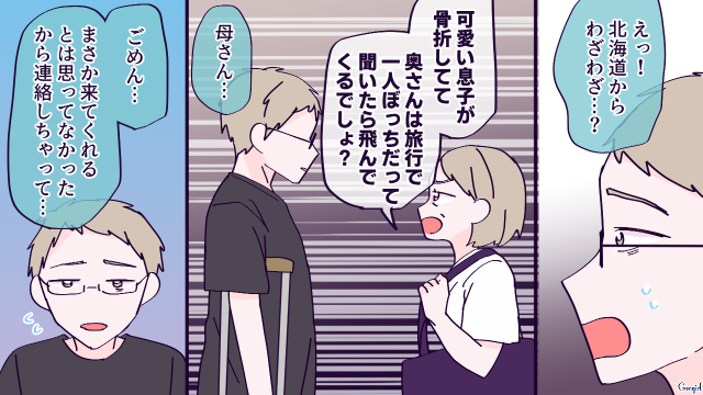 骨折して不自由な生活を送るショウタとは対象的に、沖縄旅行を満喫したケイコ。百歩譲って旅行に行くにしても、せめて最低限の家事は済ませてほしいですよね。北海道から母親が来てくれて安堵するショウタと、どうせ文句を言っているはずだと不満をあらわにしたケイコなのでした。