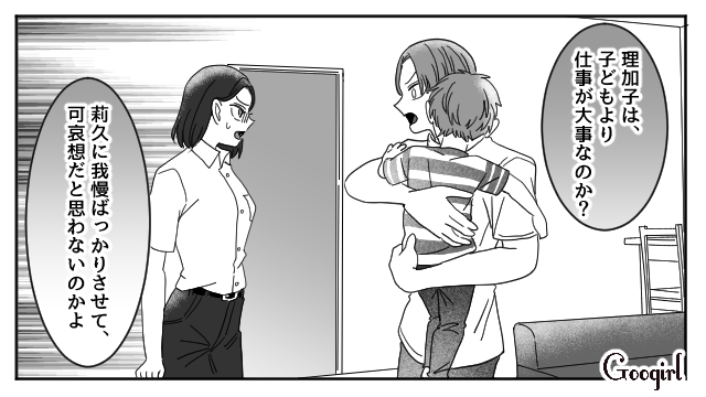 これまで一度も保育園の送り迎えをしたことがない純也。残業もできず、課長になったミドリに迷惑ばかりかけてしまいます。そんなある日、大事な会議の前に莉久が熱を出したと連絡が来ます。純也にお迎えに行ってほしいと電話しますが、莉久を保育園に入れたことを責められてしまいます。「莉久が熱を出したのは理加子の責任なんだから、理加子が迎えに行くべき」と言われ、慌てて保育園へ向かったのでした。
