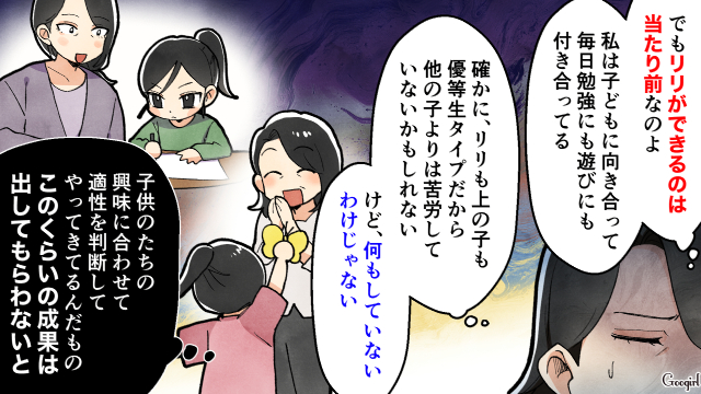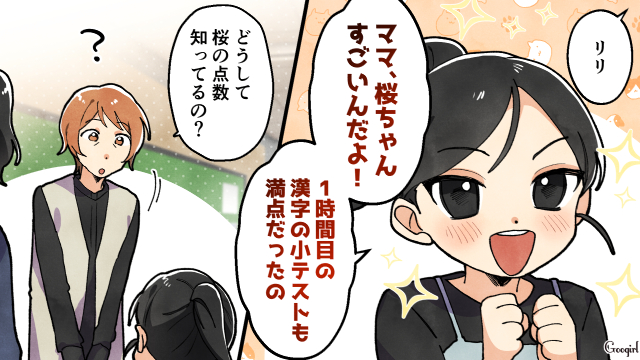 ママ友からリリが優秀だと褒められ、「低学年なんだから最低でも80点以上は当たり前」と発言したリカコ。桜が80点以下を取ることもある皐月はイラっとしますが、さらにリカコから仕事をしていて寄り添う時間がないのに、突然成績が伸びた理由は何なのかと尋ねられます。慣れない1年生の頃と比べ余裕ができ、時間がないながらも親子で一生懸命頑張っている皐月はモヤモヤしたのでした。