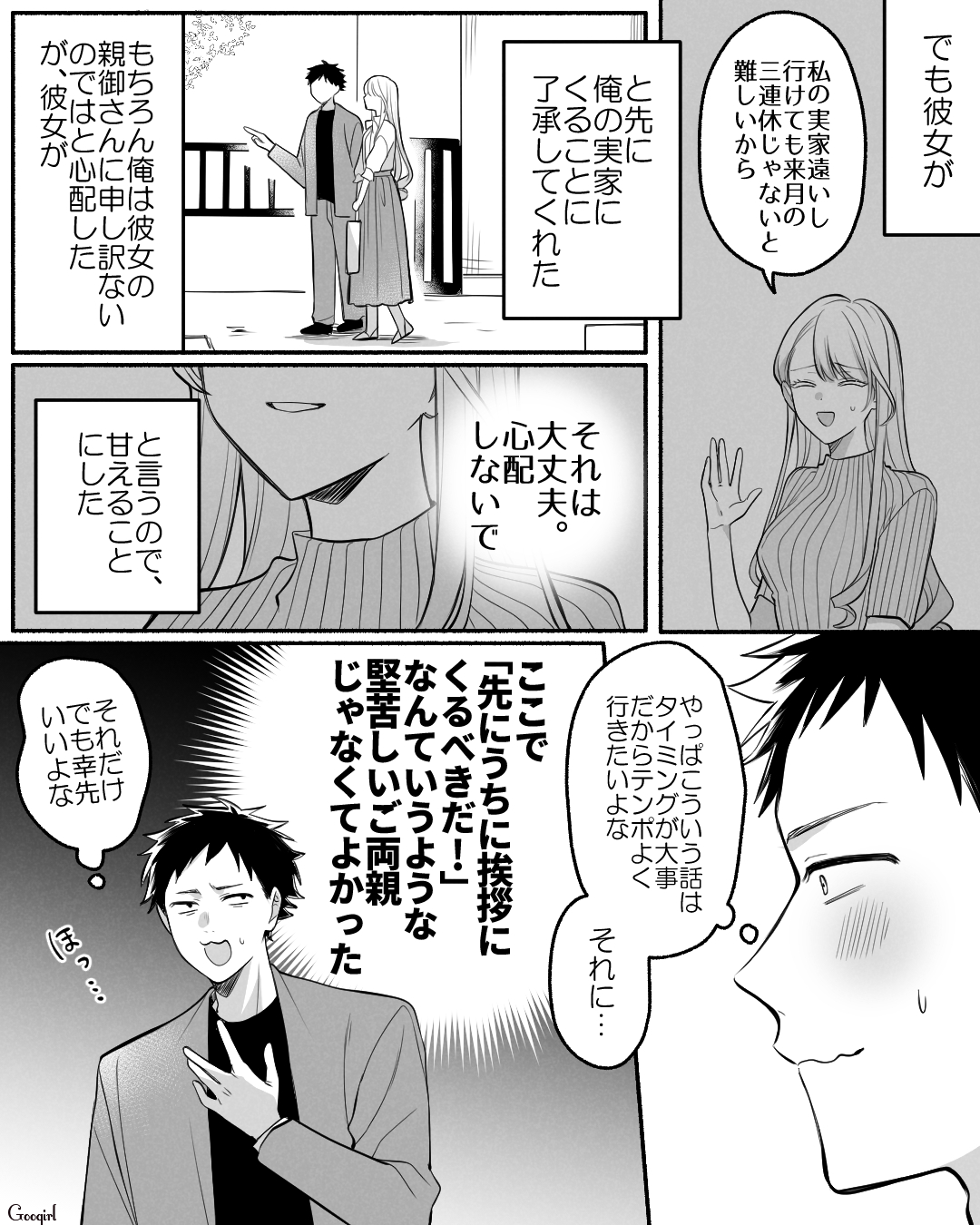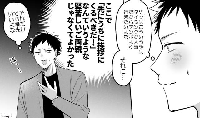 このたび彼女・河村菜月と婚約した林佑馬。もともと菜月の両親に挨拶したかったものの、実家が遠いため先に佑馬の両親に挨拶することになります。早速佑馬の実家に向かったふたりですが……?