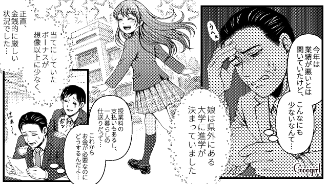 主人公・鈴田高之は妻・夏子と娘・桜子の3人家族です。この春、県外にある大学の進学が決まっている桜子。一人暮らしや授業料の支払いなどで出費が増えるものの、高之のボーナスが想像以上に少なく……?