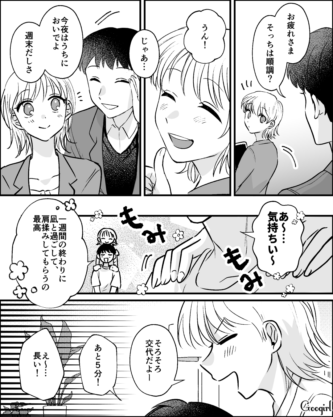仕事終わりにおうちデートした凪と智久。お互いの肩を揉み合い、1週間の疲れを取ったのでした。お互いに素でいられるような、何気ない日常が幸せですよね。