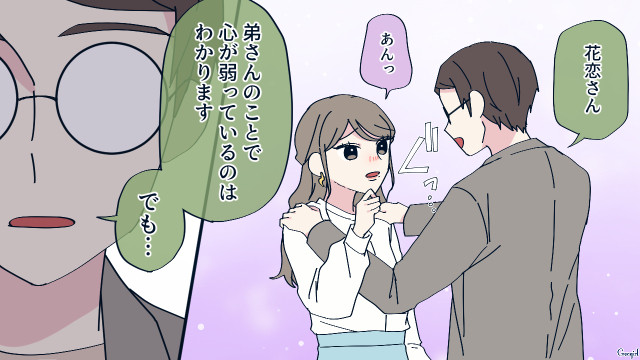「別れさせ屋」として本屋に出向き、修一に接近した花恋。偶然を装って同じ本を取り、弟が不登校と嘘の身の上話をしました。カフェで話を聞いた修一は、熱心にアドバイスします。後日不登校の弟に悩んだ花恋を気遣い、食事に誘った修一。そこで花恋からアプローチされるも、さりげなくかわしました。そんな誠実な姿にドキドキした花恋だったのでした。