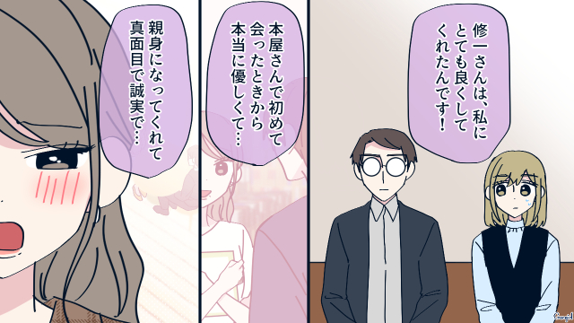 「別れさせ屋」として本屋に出向き、修一に接近した花恋。偶然を装って同じ本を取り、弟が不登校と嘘の身の上話をしました。カフェで話を聞いた修一は、熱心にアドバイスします。後日不登校の弟に悩んだ花恋を気遣い、食事に誘った修一。そこで花恋からアプローチされるも、さりげなくかわしました。そんな誠実な修一にドキドキした花恋だったのでした。
