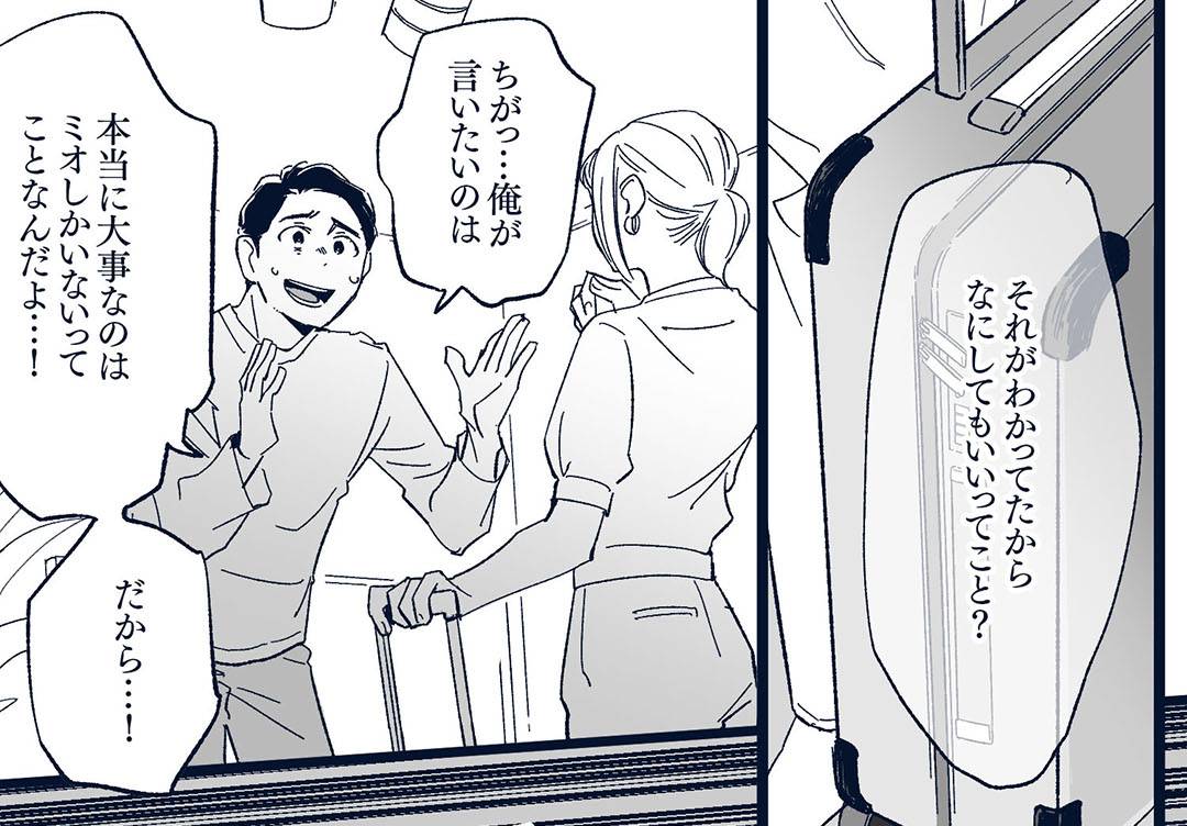 自分のことしか考えていないユウキにあきれたミオは、荷物を持って家を出て行くのでした。浮気がバレたらどうなるかくらい想像できたはずなのに、自分の保身しか考えていない人は捨てられても仕方ないですよね。