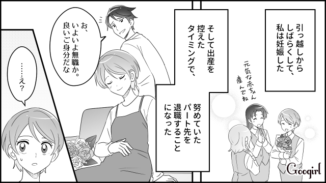 主人公・佐伯真紀は夫・俊夫と職場で出会い、結婚します。その後すぐ俊夫が遠方に転職したため、仕事を辞めパートをはじめた真紀。しばらくして妊娠が発覚しパートを辞めますが、俊夫から「いよいよ無職か。良いご身分だな」と言われ……?