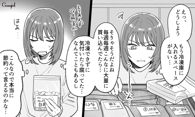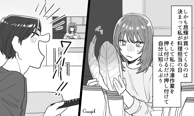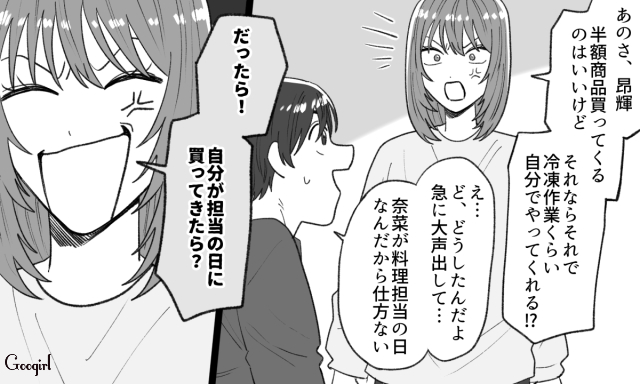 同棲前、曜日ごとに家事の役割分担を決めていたふたり。ある日の残業帰り、昂輝が今日賞味期限の半額商品を大量に買ってきます。しかし料理担当の奈菜に冷凍作業を押しつけ、自分はお風呂に入ってしまったのでした。