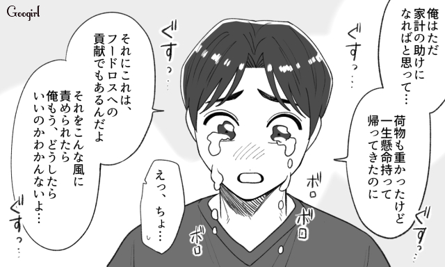 奈菜の料理担当の日に大量の半額商品を購入し、冷凍作業を押しつけた昂輝。堪忍袋の緒が切れた奈菜から注意されるも、泣いて言い訳したのでした。もとはといえば冷凍作業をしなかった昂輝が悪いのに、泣いて奈菜を困らせたなんてズルいですよね。
