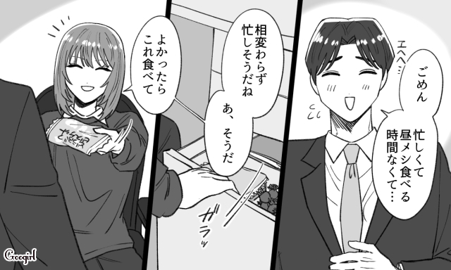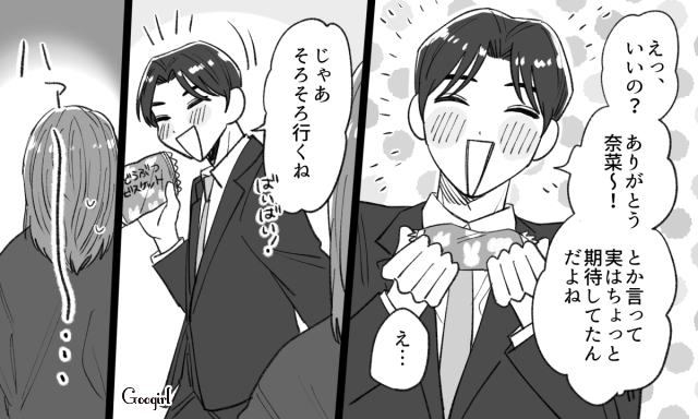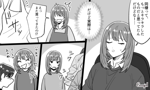 同棲前、曜日ごとに家事の役割分担を決めていたふたり。ある日の残業帰り、昂輝が今日賞味期限の半額商品を大量に買ってきます。しかし料理担当の奈菜に冷凍作業を押しつけ、自分はお風呂に入ってしまいました。それ以来、奈菜の料理担当の日に大量の半額商品を購入し、冷凍作業を押しつけるようになりました。堪忍袋の緒が切れた奈菜が注意しますが、泣いて言い訳したのでした。
