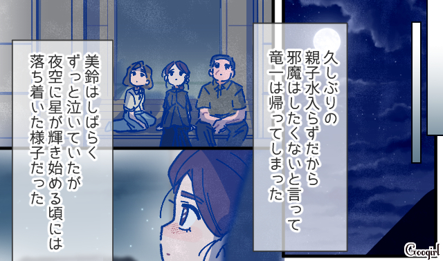 その後、庭の縁側で思い悩む大吾のもとに美鈴と学、幸恵がやってきます。幸恵は美鈴が流産したため1000万円を手切れ金とし、今後二度と関わらないように告げてきたのです。さらに郷田家の財産狙いで、ほかの男の子どもを妊娠していたのではと侮辱してくる学を殴った竜一。殴られたことに驚いた学と幸恵は、捨て台詞を吐いて去っていきました。ようやく滝本家に帰って来られた美鈴は、大吾たちに迎え入れられたのでした。