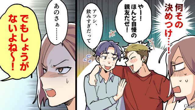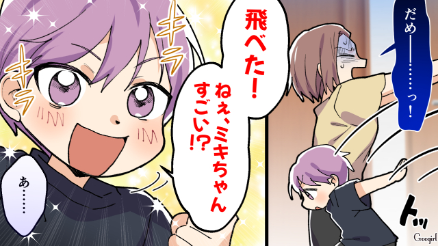 酒盛りをはじめた友達夫婦ですが、レンがトイレに行きたいと言い出します。レンについていかないふたりを見て、ミキがトイレの前まで一緒に行きます。しかし案の定レンがトイレを失敗し、ショックを受けます。仕方のないことだから怒ってはダメだと言い聞かせ掃除をしますが、マリナから潔癖扱いされてしまいます。