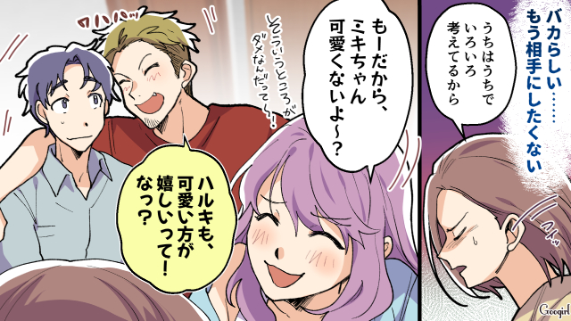 子どもたちを前にし、何とか怒りをおさえたミキ。しかし家のローンの金額を知ったアツシが、「ハルキの稼ぎがよくてよかったな」と言ってきます。自分も働いていると伝えたミキでしたが、ハルキを立てるべきだと笑われたのでした。