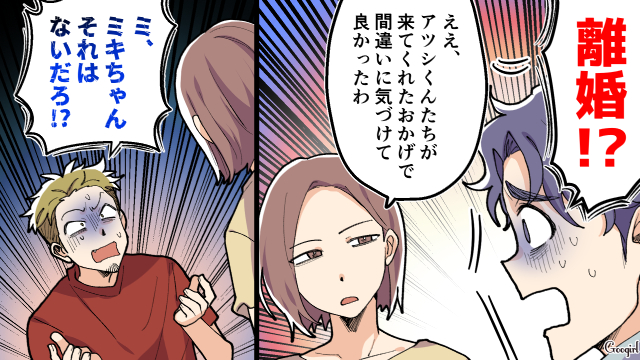 ミキが離婚を切り出し、慌ててフォローしたアツシ。でもミキが本気で怒っているのにつまらない夫婦喧嘩と言ったり、この期に及んでもなお家に来ようとしていたりと、どこかズレていたのでした。逆ギレしたマリナも含め、あらためて話が通じない人たちだと感じてしまいますね。